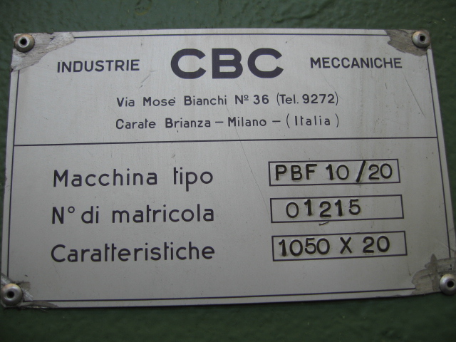Cattaneo DavideCesoia usata marca CBC meccanica modello PBF 10/20 capacità di taglio 1200 x 20mm, registro motorizzato da 550mm, impianto elettrico nuovo macchina revisionata perfettamente funzionante.